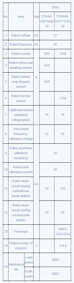 Tekniske parametre for FLN48-12D type indendørs HV SF6 belastning
