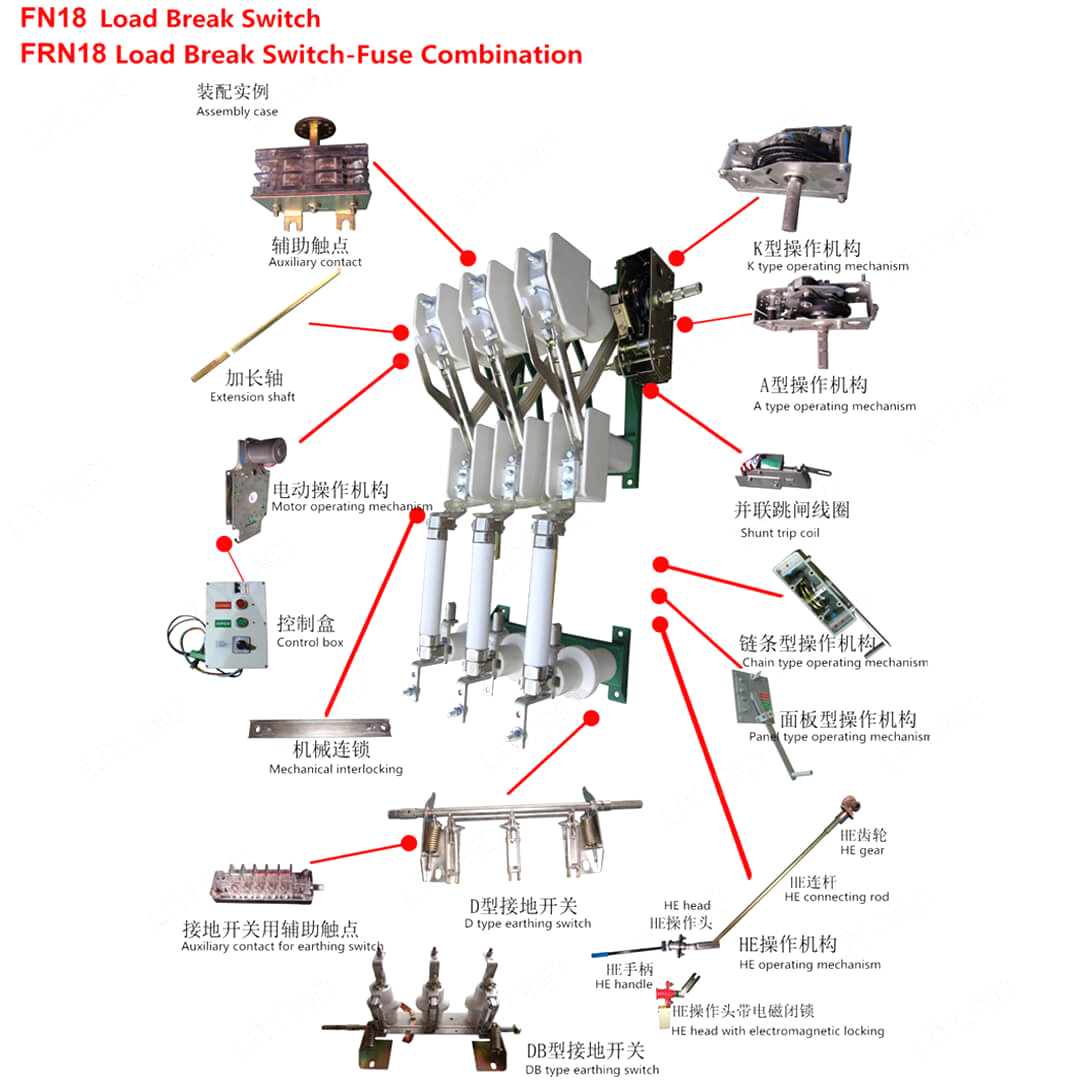 Standard FN18-switch inkluderer en kraftig stålramme med stand-off isolatorer, en unik puffer-type lysbue-slukningssystem, en driftsmekanisme og strømforsyningskomponenter, herunder interrupt af bladtype med støbte hængsler og kæberstik.