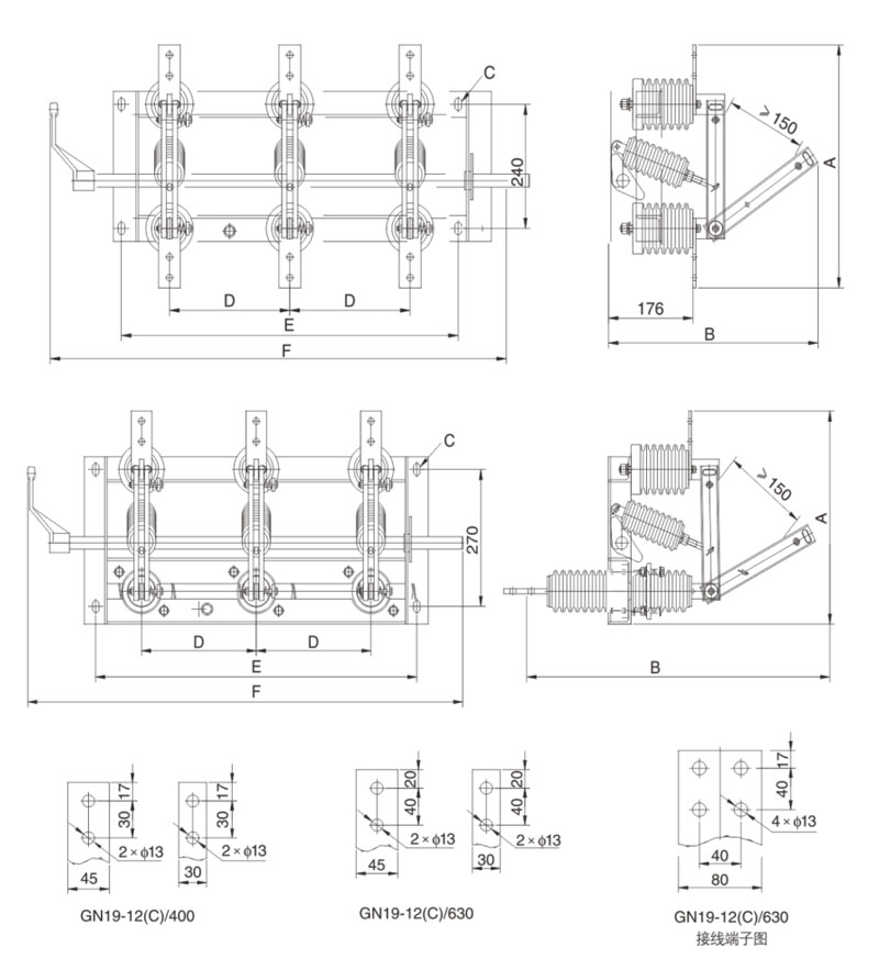 GN19-12 (c) Indendørs HV-afbrydelseskontakt gælder for kraftsystemet for nominel spænding 12 kV, AC 50/60Hz. Det er udstyret med CS6-1-manuel driftsmekanisme og bruges til at bryde og fremstille kredsløb under no-load. Der er yderligere forureningstype, højhøjde type og effekt, der indikerer type. Det er lavet i henhold til IEC 62271-102.