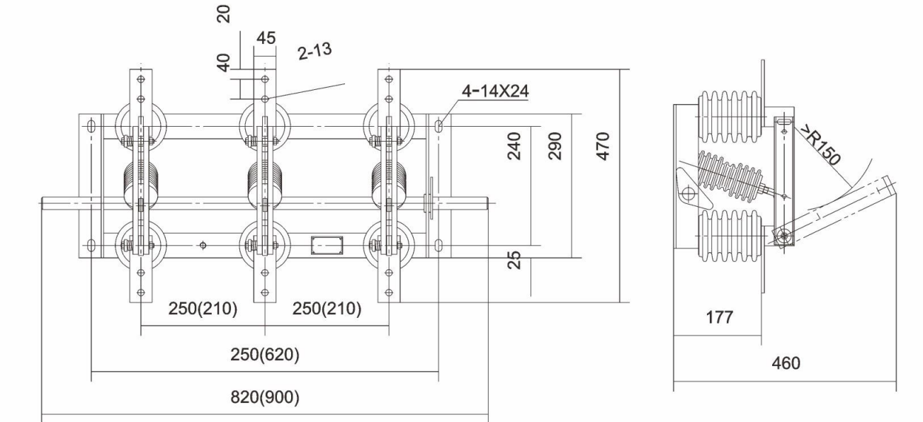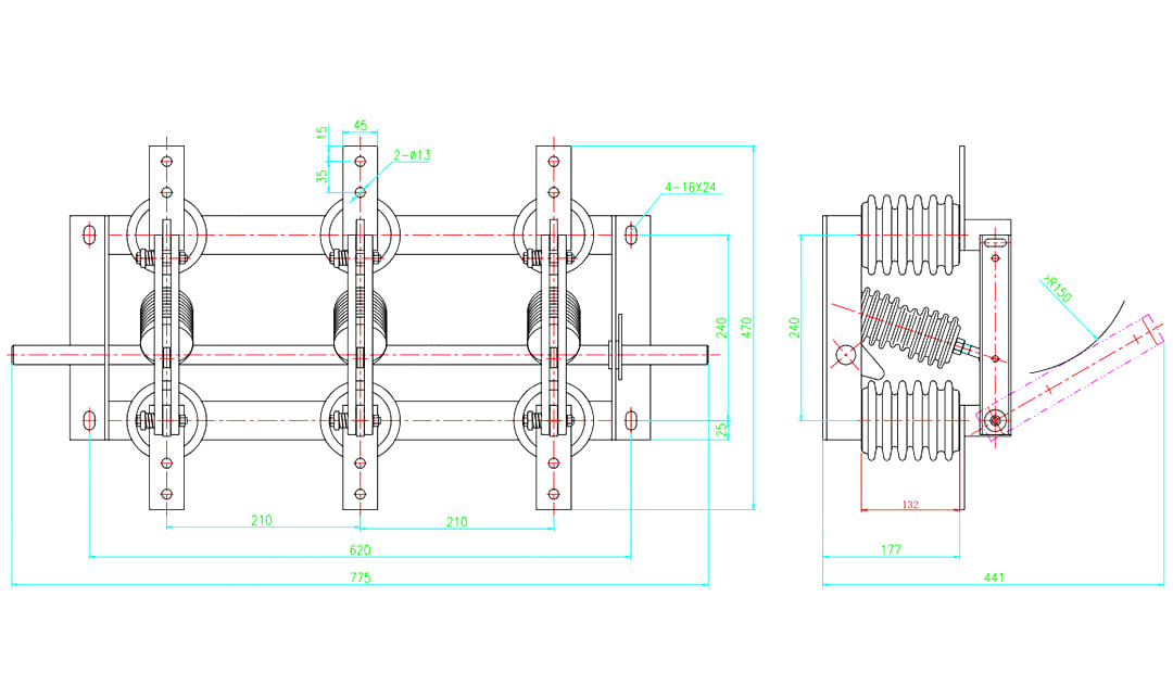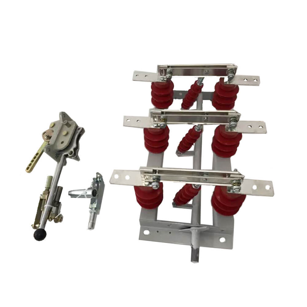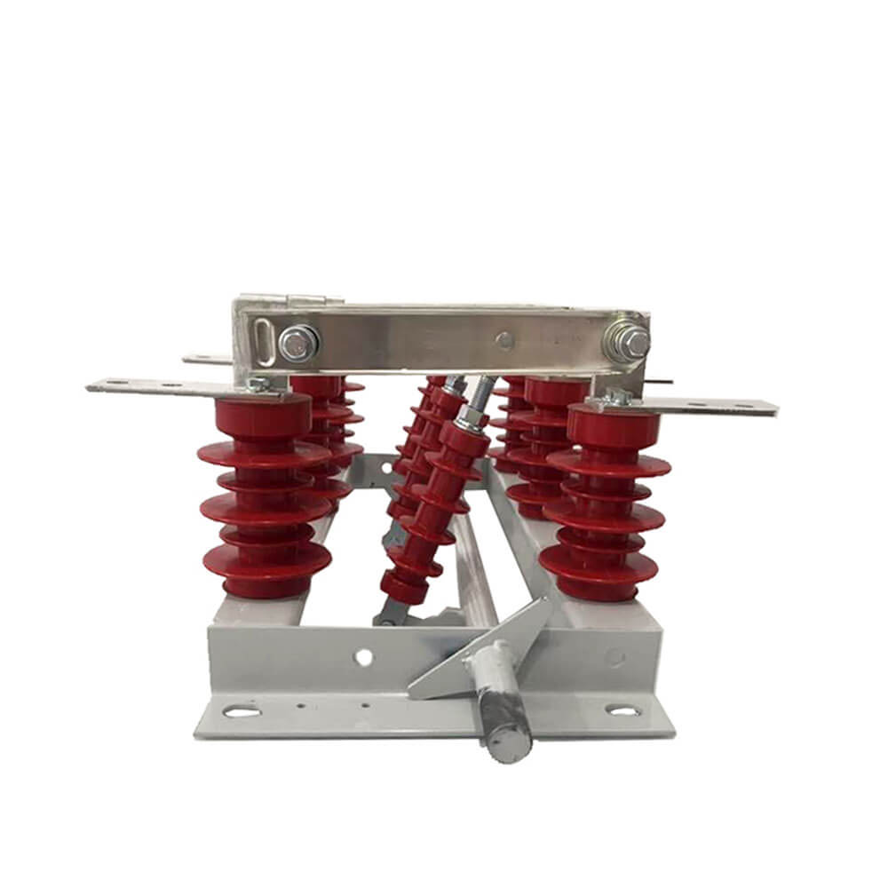 Den ledende del af GN19-12/400, 630, 1000, 1250 type afbryderkontakt er fastgjort på bunden af to søjleisolatorer for hver fase. (GN19-12C/400, 630, 1000, 1250 typen har en søjleisolator og en porcelænshusisolator.) De tre faser er installeret parallelt, og den ledende del består af statiske kontakter af kontaktknive og kontaktholdere (eller ledende stænger). Hver fase af kontaktkniven er forbundet til midten af bindeisolatoren, bindeisolatoren og installeret på bunden af den tilsluttede spindel. Spindlen er forbundet til plejlstangen (leveret af brugeren) og CS6-1 type bevægemekanisme gennem håndtaget. Forbindelseskontaktkniven er sammensat af to slidsede kobberplader, som ikke kun øger kontaktknivens varmeafledningsareal for at sænke bundtemperaturen, men også forbedrer kontaktknivens mekaniske styrke, så kontaktens dynamiske stabilitet forbedres. Den ene ende af kontaktkniven er monteret på kontaktblokken (eller på den ledende stang) med en bolt (bil fra Shaw). GN19-12/1000, 1250 i kontakt med installation af magnetisk låseplade, plus formålet med den magnetiske låseplade er, at når en stor kortslutningsstrøm for at forbedre de to riller kontakt kniv mellem de| attraktion. GN19-12/400, 630 afbryderkontakter har en lille grænse gennemstrøm, så der er ingen grund til at tilføje en magnetisk låseplade.