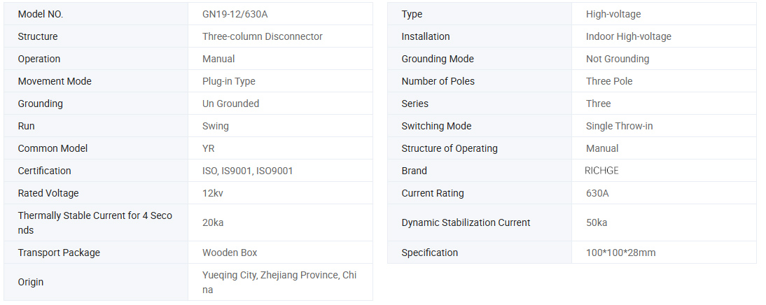 GN19-12(c)-serien indendørs AC højspændingsisoleringsafbryder er velegnet til AC 50hz, nominel arbejdsspænding på 12kv, 10kv, nominel arbejdsstrøm på 400A, 630A, 1250A strømsystem, som en spænding og ingen belastning under tilstanden af at bryde, lukket kredsløb indendørs spændingsanlæg, 2rkv-indendørs strømafbrydersystem, udstyret med manuel strømforsyningsmekanisme. bruges til at skifte elektriske apparater under betingelse af spænding, men ingen belastning, Der er også afsendt til at producere anti-fouling type, plateau type og live display enheder, der kan installeres. GN19-12-serien indendørs højspændingsafbryder er en indendørs enhed med nominel spænding på 12kv og trefaset AC 50hz.