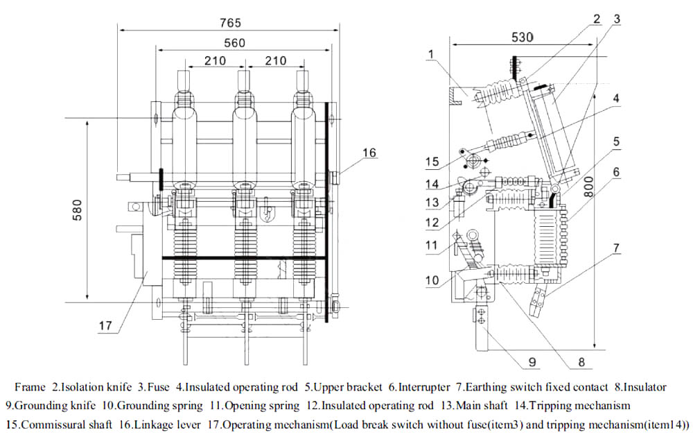 FZN21-12-serie højspændingsvakuumbelastningskontakt er hovedsageligt sammensat af framer, afbrydelsesafbryder (strømbegrænsende sikring af kombineringen er i afbrydelseskontakten), vakuumafbryderrør, jordforbindelsesafbryder, forårets driftsmekanisme og så videre.