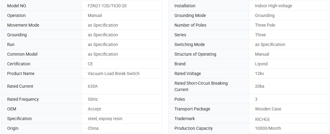 FZN21-12D/T630-20, FZN21-12DR/T125-31.5 Type højspændingsvakuumbelastningsafbryder og sikringsafbryder fungerer i tre-faset AC-elektrisk 12 kV, 50Hz strømfordelingssystem, med en kompakt, lille størrelse, letvægt, lang levetid, høj udformning og breaking-evne, sikker og pålidelig, og hvis belastningskontakt samarbejdes med fuse namen, kan erstatte dem, der erstatter trict trussle truss Sikringer med højere omkostninger, let og praktisk drift og vedligeholdelse