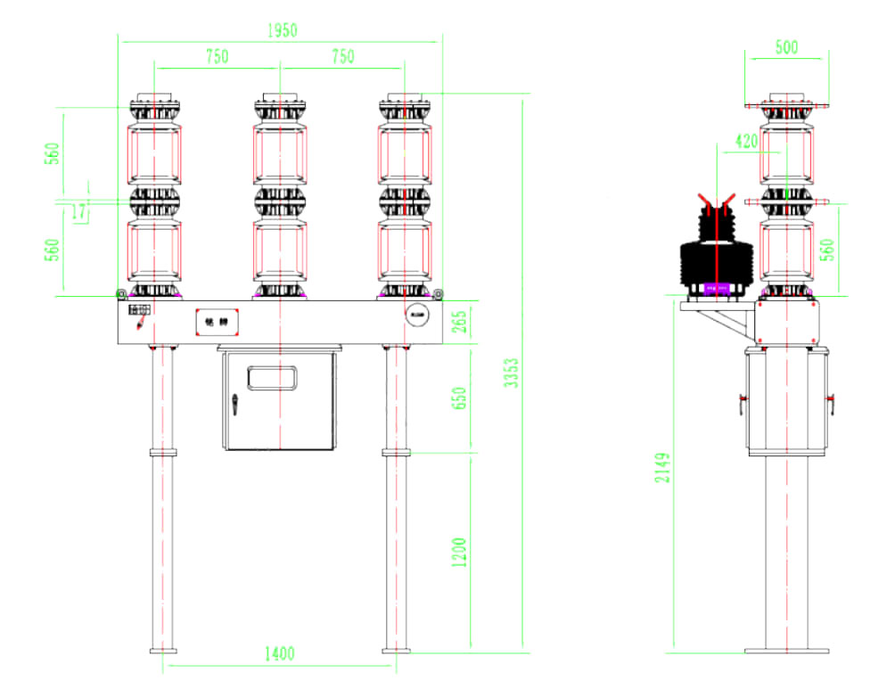 Produktet har en fremragende breaking ydelse, bruger tryklufttypen Arcslukkekammer, det elektriske liv er langt, erstatter ikke svovlhxafluoridgas, den mekaniske pålidelighed er høj, det mekaniske liv er langt, kan operere ofte; Hvert sæt kan udstyres med 6-12 strømtransformatorer til brugerens valg. Dette produkt vedtager den nye MKZ Model SF6 -markørdensitetsmåler, trykmålerens aflæsning påvirkes ikke af temperaturændringen, let at bruge.