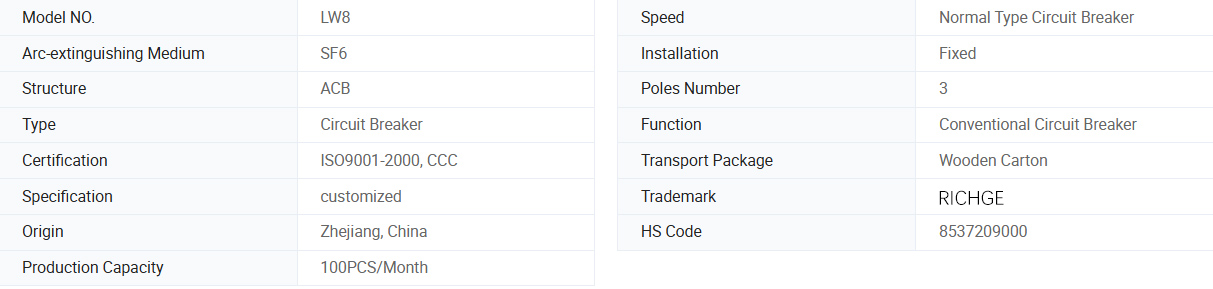 LW8-40.5, LW8A-40.5-serien Svovl hexafluoridafbrydere er trefasede AC 50Hz udendørs højspændingselektrisk udstyr, der er egnet til kontrol og beskyttelse af 40,5 kV transmissions- og distributionssystem, kan også bruges til forbindelseskredsløb og åbne og tæt kondensatorbanker. Produktet kan bruges med CT14 -fjedermekanisme. Circuit Breaker er i overensstemmelse med National Standard GB1984-1989 AC højspændingskredsløb og den internationale elektrotekniske kommission Standard IEC56, IEC6220-100 højspændings AC-afbryder.