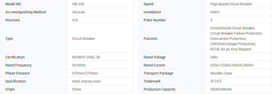 VBI-24 VCB monteret normalt i switchgear-panelet KYN28 og XGN. Det er anvendeligt i lejligheder med hyppig drift, har funktioner af højhastighedsrecloser, multiple åbning/lukning, pålidelig mekanisk sammenlås. Det har fast type og tilbagetrækkelig type. Det vedtager det sammensatte isolerede materiale, der er ingen forurening og eksplosionsfare, isoleringsniveauet er højt.