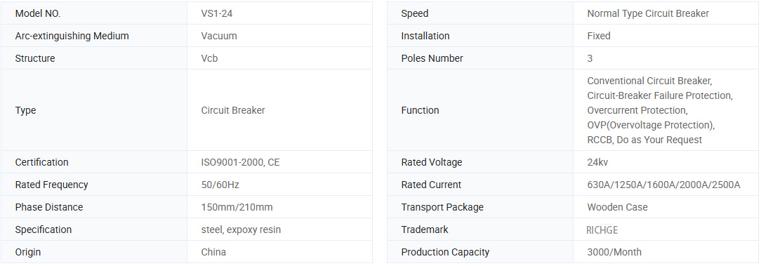 VS1-24-serien af indendørs højspændingsvakuumafbryder med almindelig isoleret cylinder er tre-phrase A.C. 5O Hz indendørs strømfordelingsudstyr med den nominelle spænding på 24 kV. Det bruges til at beskytte kontrol af den elektriske eguipment inden for industri og minedrift, kraftværker og substation. Denne type vakuumafbryder er i overensstemmelse med nationale standarder og bestemmelsen af IEC-standarden, kapaciteten når kvaliteten af M2-E2-C2.
