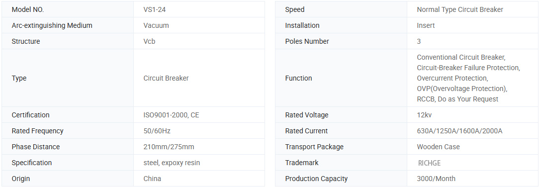 VS1-24-serien af indendørs højspændingsvakuumafbryder med almindelig isoleret cylinder er tre-phrase A.C. 50 Hz indendørs strømfordelingsudstyr med den nominelle spænding på 24 kV. Det bruges til at beskytte kontrol af det elektriske udstyr inden for industri og minedrift, kraftværker og substation. Denne type vakuumafbryder er i overensstemmelse med nationale standarder og bestemmelsen af IEC-standarden, kapaciteten når kvaliteten af M2-E2-C2.
